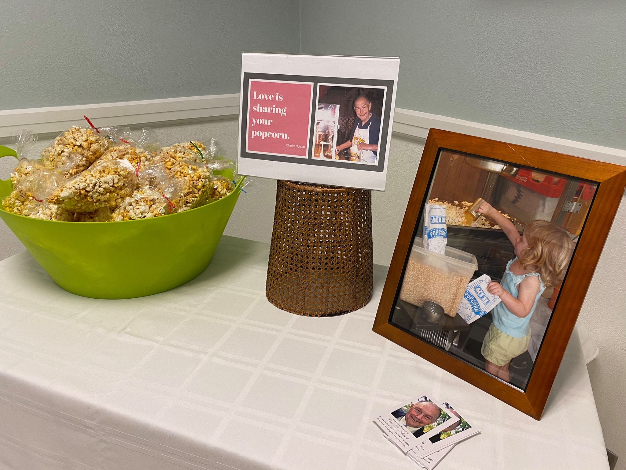 The love my dad carried in his heart could always be seen in his bright eyes, and smile. My dad’s love language was often expressed through sharing gifts with the people he met, and anyone who frequented their home. People rarely left my parents’ house empty handed. At some point he probably gave you a pen, a bag popcorn, lollipops, or in a couple cases, a Christmas tree. In honor of my dad, you will not leave here empty handed either. My mom and I had fun making his signature popcorn for everyone. And, please do not forget to keep your pens.